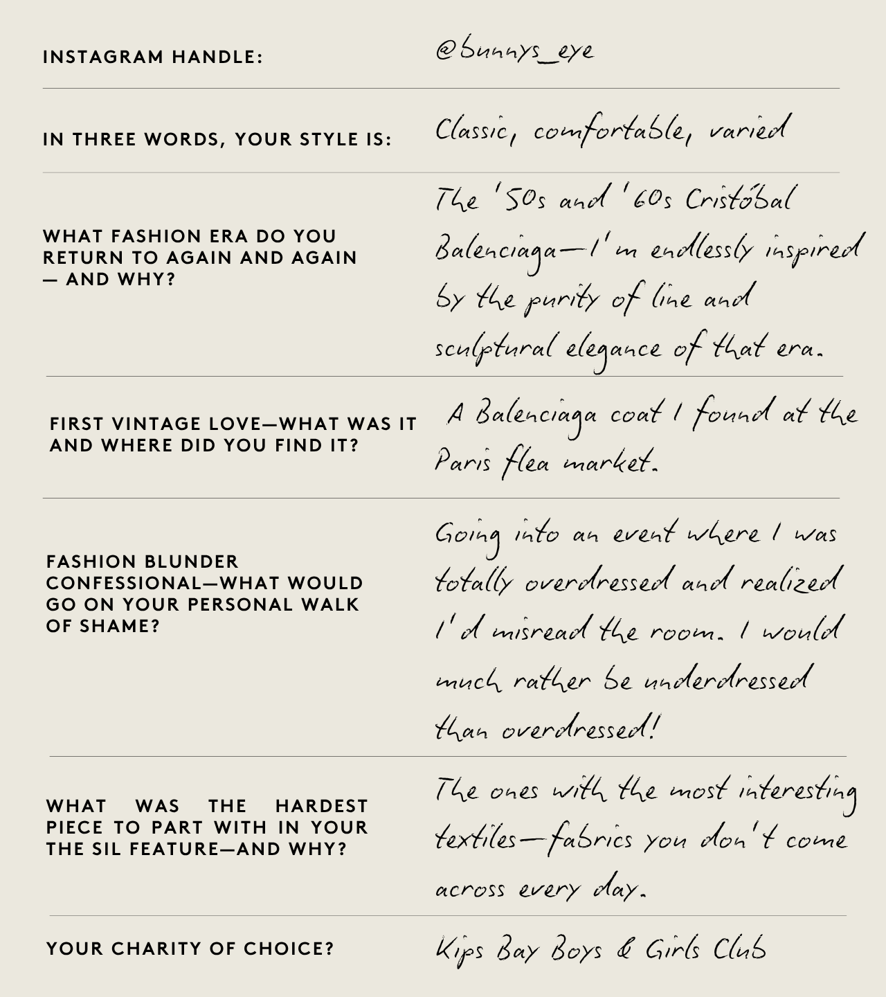 Bunny Williams is one of the defining voices in American interior design, known for her effortless balance of comfort and elegance, shaped by her early years at Parish-Hadley and her own celebrated practice. A devoted admirer of 1950s and ’60s Cristóbal Balenciaga, she has long been drawn to the purity of line and sculptural simplicity of that era—her first vintage purchase a Balenciaga coat found at a Paris flea market. For The SIL, she shares pieces that reflect her collector’s eye, from independent labels like Dovima Paris to rare textiles she admits are hardest to part with, all grounded in her belief in ease and understated dressing.